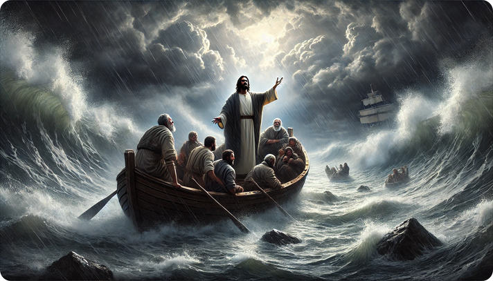 Dejando a la gente, se lo llevaron en barca, como estaba; otras barcas lo acompañaban. Se levantó una fuerte tempestad y las olas rompían contra la barca hasta casi llenarla de agua. Él estaba en la popa, dormido sobre un cabezal. Lo despertaron, diciéndole: