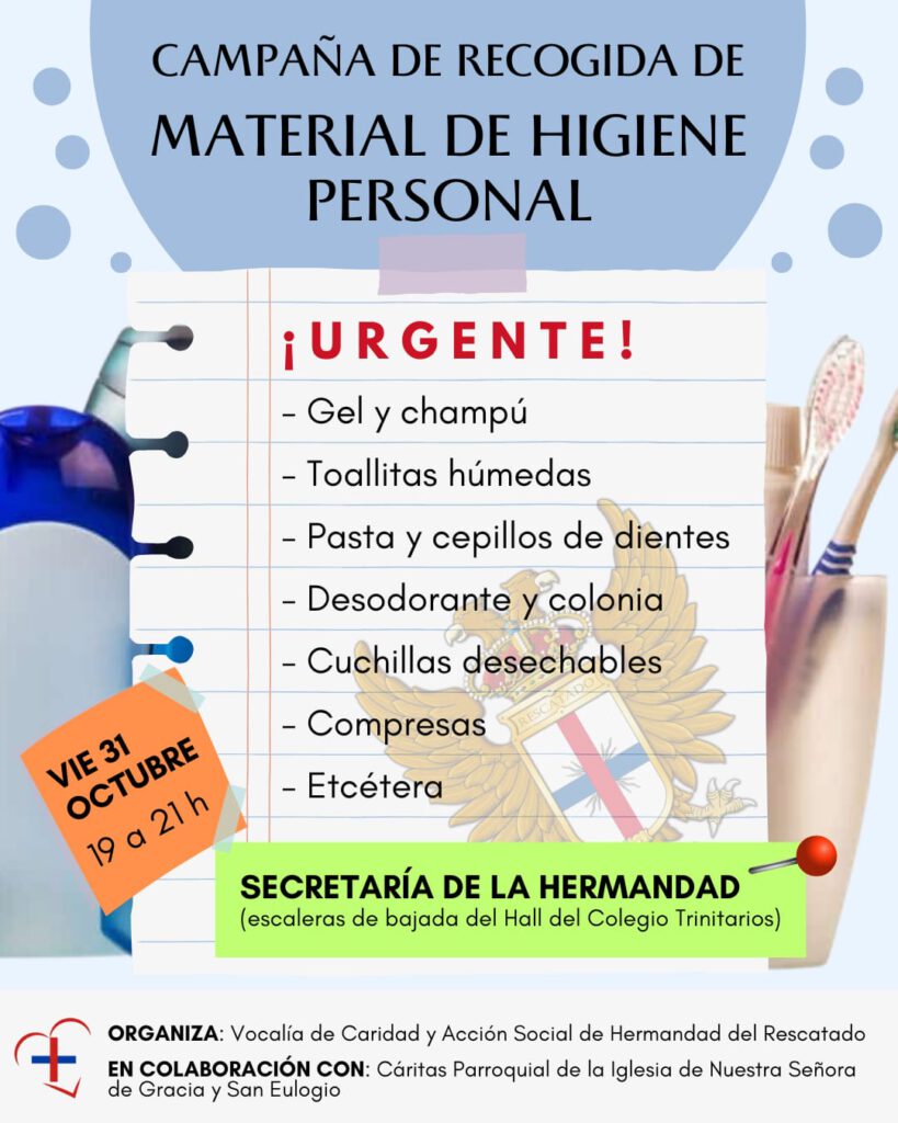 La Hermandad del Rescatado de Córdoba, a través de su Vocalía de Caridad y Acción Social, ha puesto en marcha una campaña solidaria urgente destinada a recoger productos de higiene personal para las personas más necesitadas. La iniciativa se desarrolla en colaboración con Cáritas Parroquial de la Iglesia de Nuestra Señora de Gracia y San…