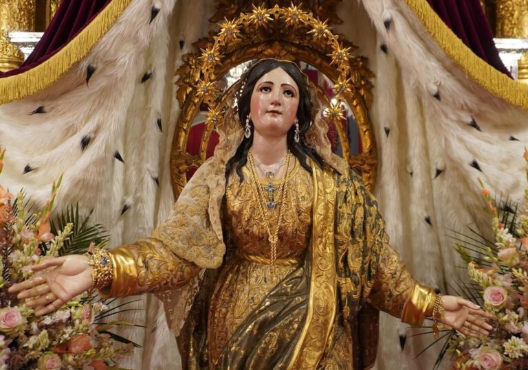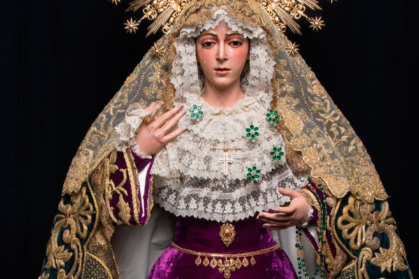 Amanece la Virgen de la Esperanza ataviada para su Septenario con el manto ‘Esperanza Nuestra’, pieza realizada en 1962 por Guillermo Carrasquilla Perea con bordados procedentes del palio de Rodríguez Ojeda de 1907 y del de Victoria Caro de 1942. La toca de sobremanto es la conocida «toca de las rosas», interesante pieza fechada en…