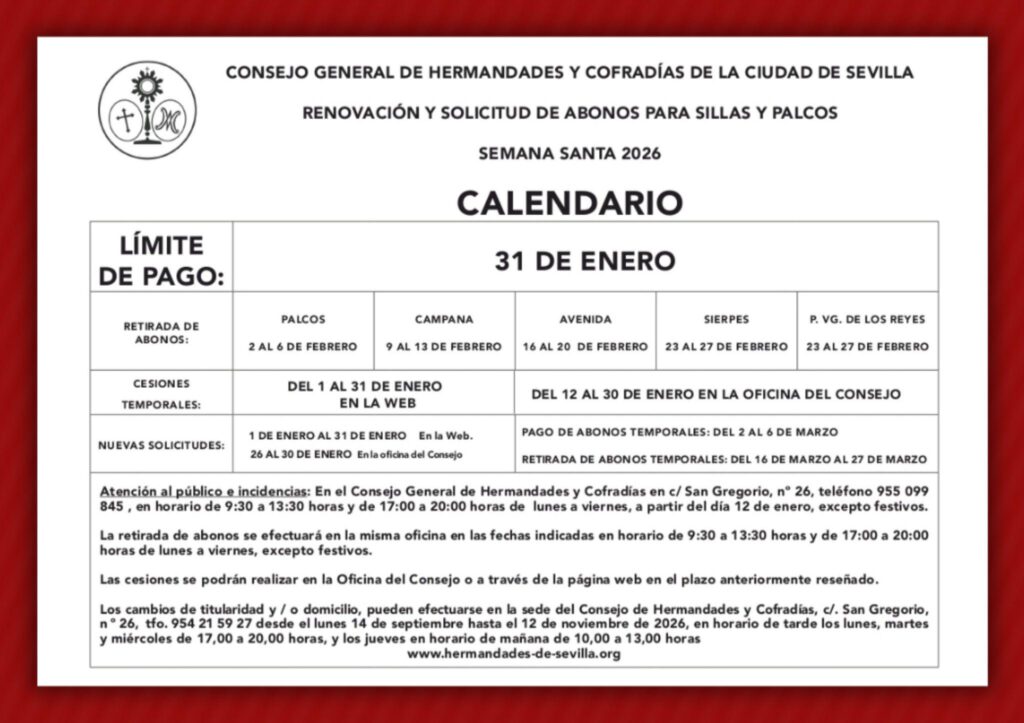 El Consejo de Hermandades y Cofradías de Sevilla ha anunciado la apertura del proceso de gestión de sillas y palcos para la Semana Santa de 2026, poniendo a disposición tanto de abonados como de nuevos solicitantes la plataforma online habilitada para este fin. A través de este sistema digital, los usuarios podrán realizar de forma…