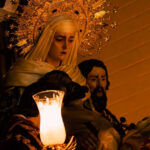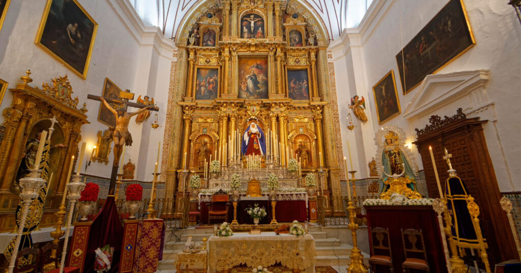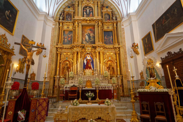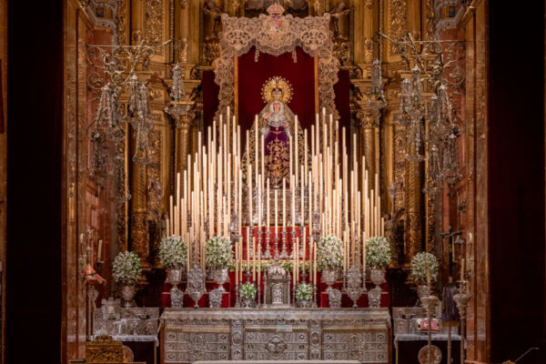 El altar se dispone con varias alturas a modo de gradas cuajadas de candelería, donde destaca la presencia de un alto dosel realizado ex profeso con los respiraderos laterales del paso de palio y la bambalina frontal realizada por Victoria Caro en 1942. Bajo este se ubica entronizada la Virgen de la Esperanza sobre su…