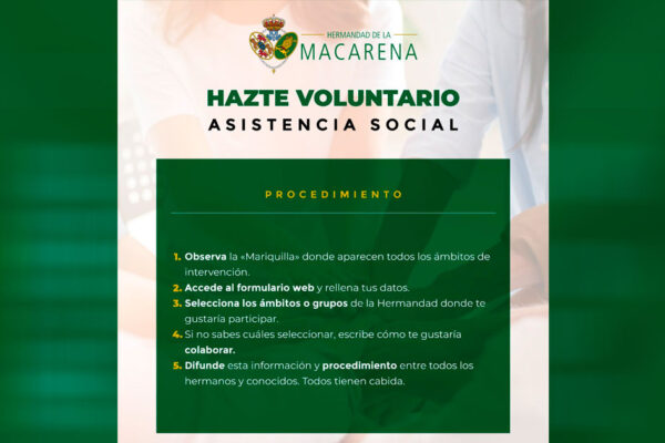 La Hermandad de la Macarena refuerza su compromiso social y lanza un llamamiento a todos los hermanos y devotos que deseen colaborar en su obra de asistencia. Queremos ser una “casa abierta” y un punto de encuentro para quienes más lo necesitan, pero para lograrlo tu ayuda es fundamental. Un voluntariado para todosNo buscamos solo…