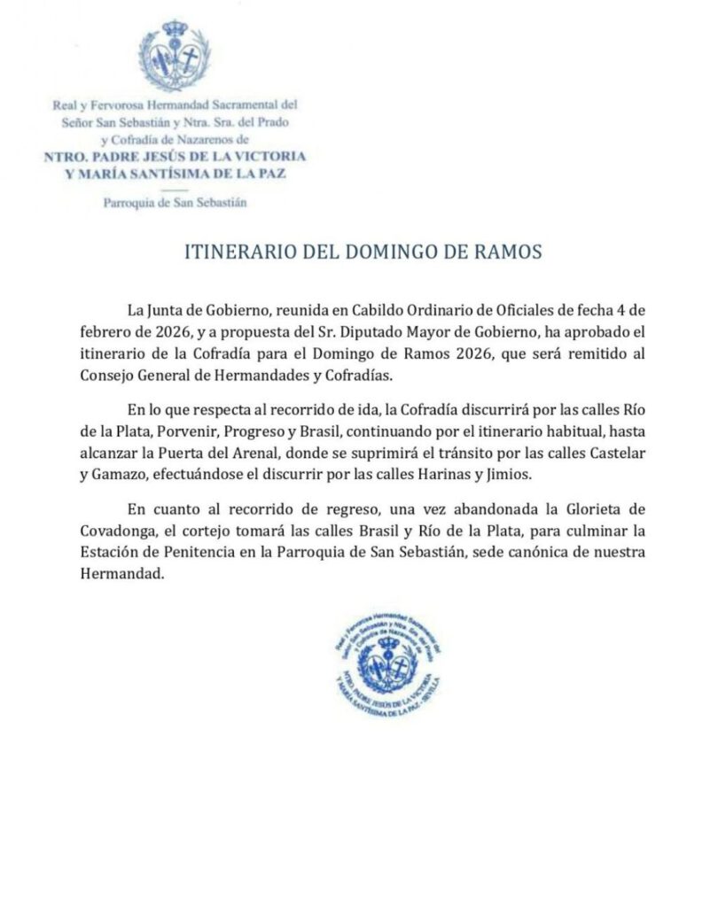 La Hermandad de la Paz ha hecho público un comunicado oficial en el que detalla modificaciones significativas en el itinerario de su estación de penitencia para el próximo Domingo de Ramos, que abrirá la Semana Santa de Sevilla el 29 de marzo de 2026.