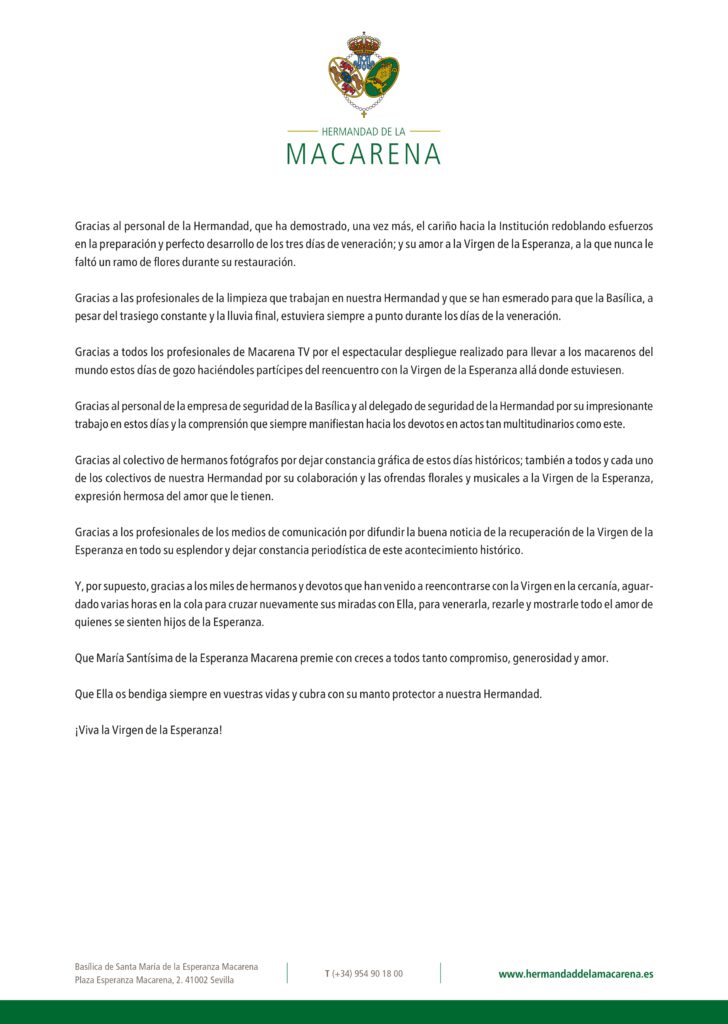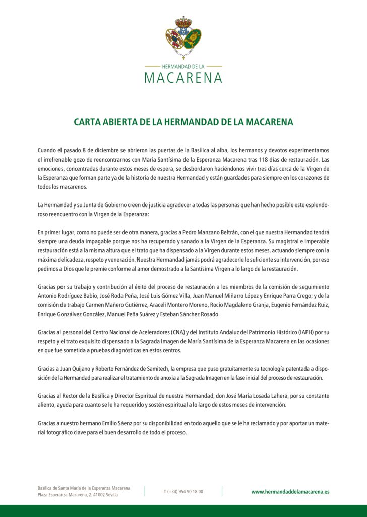 La Hermandad de la Esperanza Macarena ha hecho pública una emotiva carta abierta en la que expresa su profundo agradecimiento a todas las personas, instituciones y profesionales que han contribuido al exitoso proceso de restauración de María Santísima de la Esperanza. Tras 118 días de trabajos y un multitudinario reencuentro con la Virgen, la corporación subraya el compromiso, la entrega y el cariño recibidos durante estos meses históricos para la devoción macarena.
