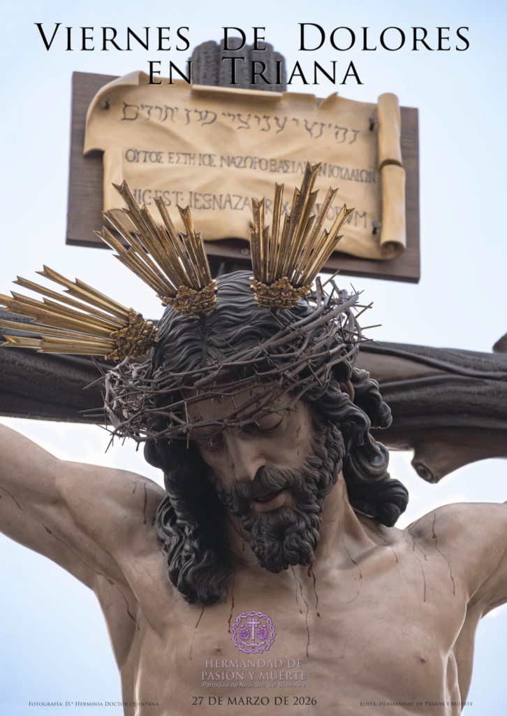 El cartel —ya disponible en la web oficial de la hermandad y difundido entre la comunidad cofrade— simboliza la solemne salida procesional del Santísimo Cristo de Pasión y Muerte, una de las estampas más características del Viernes de Dolores en Triana, que tradicionalmente reúne a hermanos y devotos antes del inicio formal de la Semana Mayor.