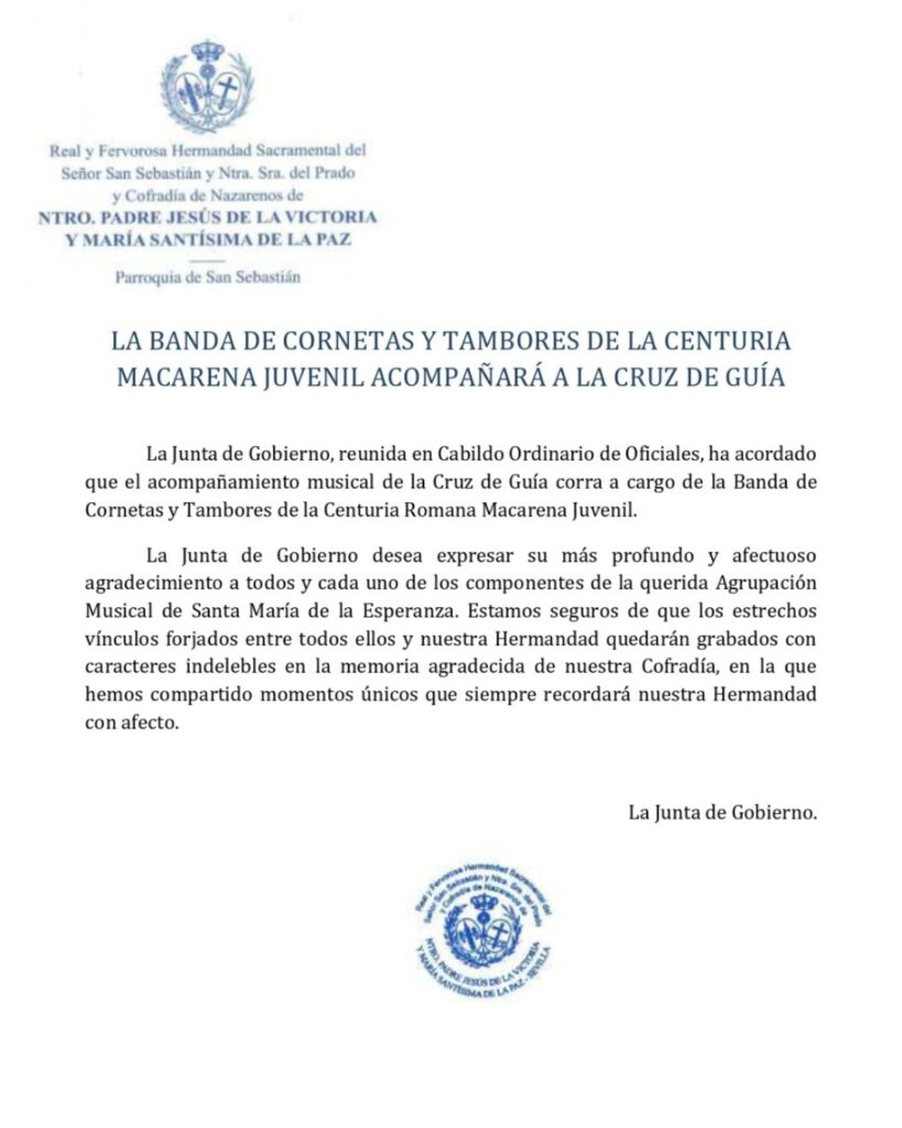 Este nombramiento queda refrendado en el comunicado oficial emitido por la Real y Fervorosa Hermandad Sacramental del Señor San Sebastián, Nuestro Padre Jesús de la Victoria y María Santísima de la Paz, con sede en la parroquia de San Sebastián. En él, la Junta de Gobierno de la corporación del Porvenir informa de que, reunida en Cabildo Ordinario de Oficiales, ha acordado que el acompañamiento musical de la Cruz de Guía corra a cargo de la formación juvenil de la Centuria Romana Macarena.