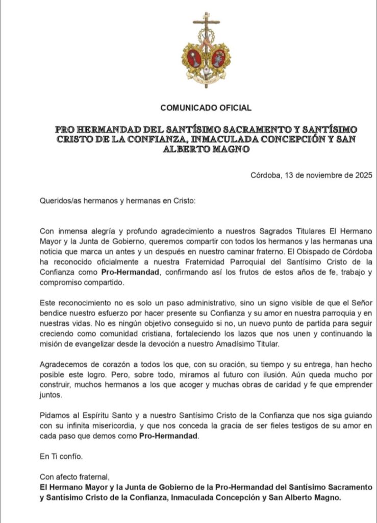 El comunicado concluye elevando una oración al Espíritu Santo y al Santísimo Cristo de la Confianza, pidiendo que sigan guiando a la corporación “con su infinita misericordia” y concedan la gracia de ser fieles testigos de su amor en cada paso que den ya como Pro-Hermandad.