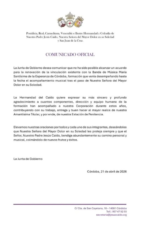 La Hermandad del Caído de Córdoba ha comunicado oficialmente que no ha sido posible alcanzar un acuerdo para la renovación de la vinculación existente con la Banda de Música María Santísima de la Esperanza de Córdoba, formación que venía acompañando musicalmente a Nuestra Señora del Mayor Dolor en su Soledad.