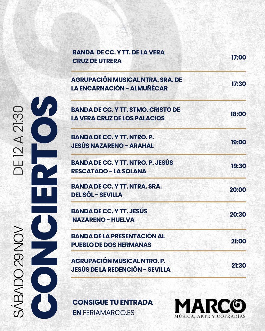 La jornada del sábado ofrecerá conciertos desde las 12:00 hasta las 21:30. Abrirá el programa la Banda de CC. y TT. de la Expiración de Santa Cruz (Murcia), seguida de formaciones históricas de Sevilla como la Agrupación Musical María Santísima del Rocío, La Encarnación de San Benito o Las Cigarreras.