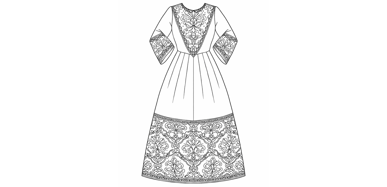 El diseño contempla la disposición del bordado en forma de grandes cenefas, repartidas de manera armónica entre las distintas piezas que componen la saya —mangas, corpiño y faldón—, logrando así una lectura unitaria y equilibrada del conjunto. Como complemento, se empleará un tejido de crepé satinado, rematándose la obra con una fina puntilla de oro entrefino que aportará un acabado de especial riqueza.