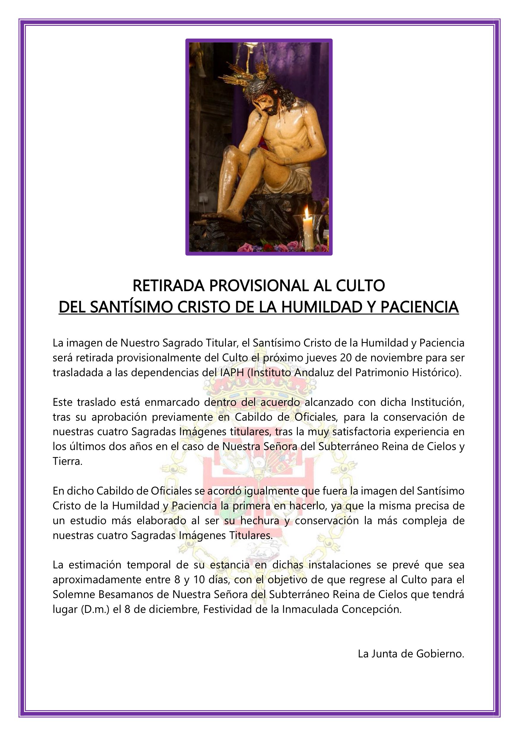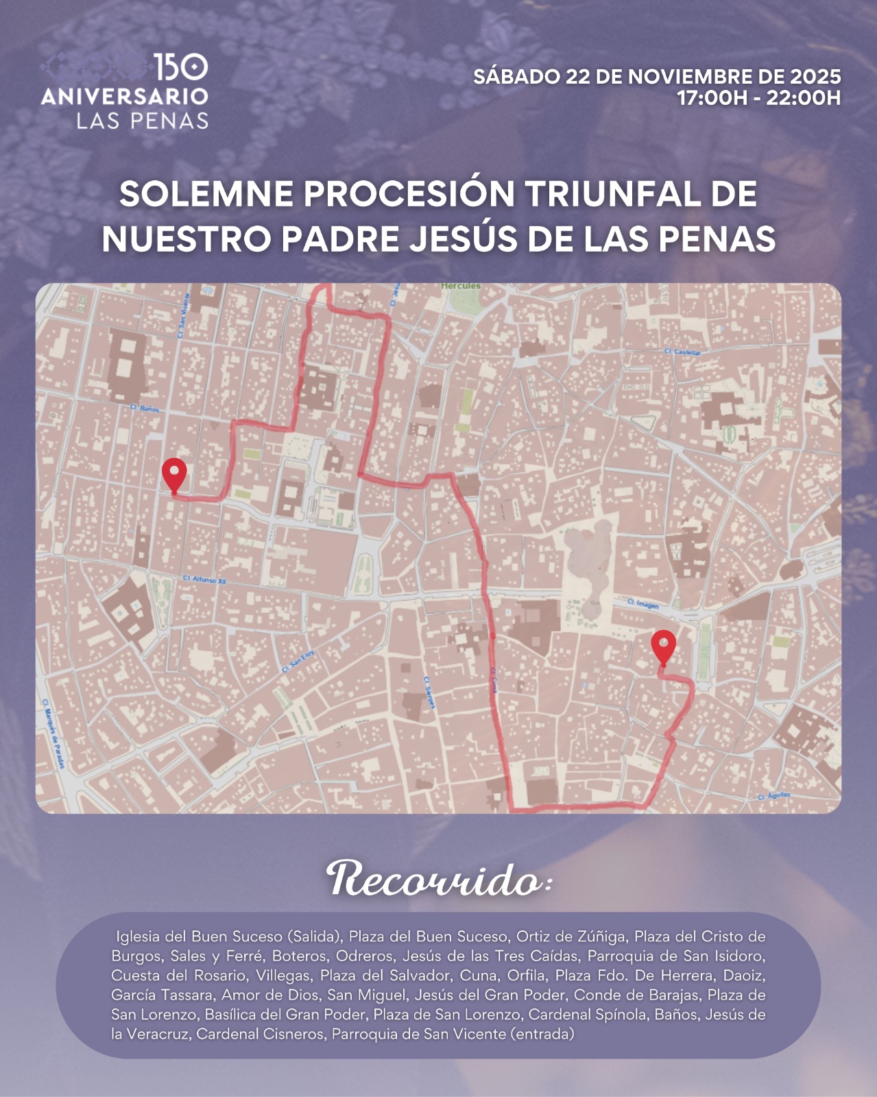 En la tarde del próximo sábado, 22 de noviembre, la Hermandad celebrará la Solemne Procesión Triunfal de Nuestro Padre Jesús de las Penas, un acontecimiento de especial relevancia devocional que llevará al Señor desde la Iglesia del Buen Suceso hasta la Parroquia de San Vicente.