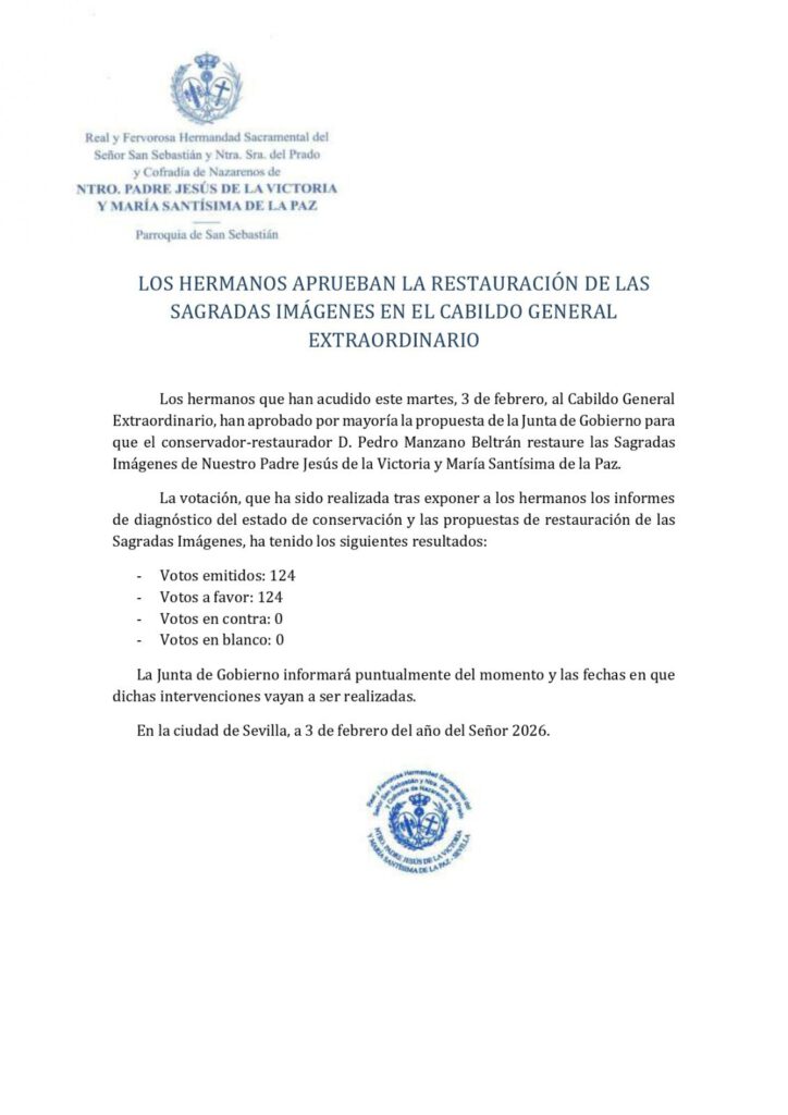 La Hermandad de la Paz ha aprobado por unanimidad la restauración de las Sagradas Imágenes de Nuestro Padre Jesús de la Victoria y María Santísima de la Paz, tras la celebración del Cabildo General Extraordinario celebrado este martes 3 de febrero.