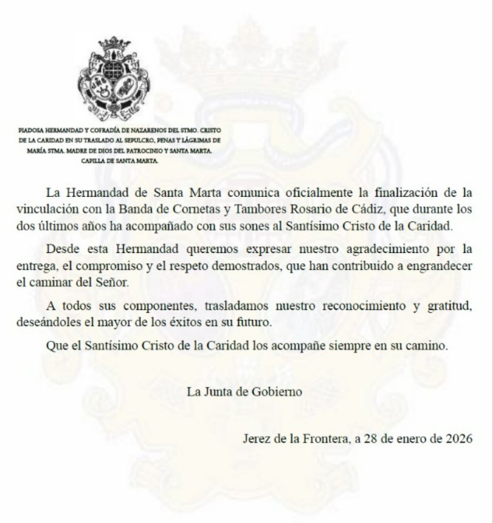 La Hermandad de Santa Marta de Jerez de la Frontera ha comunicado oficialmente la finalización de su vinculación con la Banda de Cornetas y Tambores Rosario de Cádiz, formación musical que ha acompañado durante los dos últimos años al Santísimo Cristo de la Caridad en su traslado al Sepulcro.