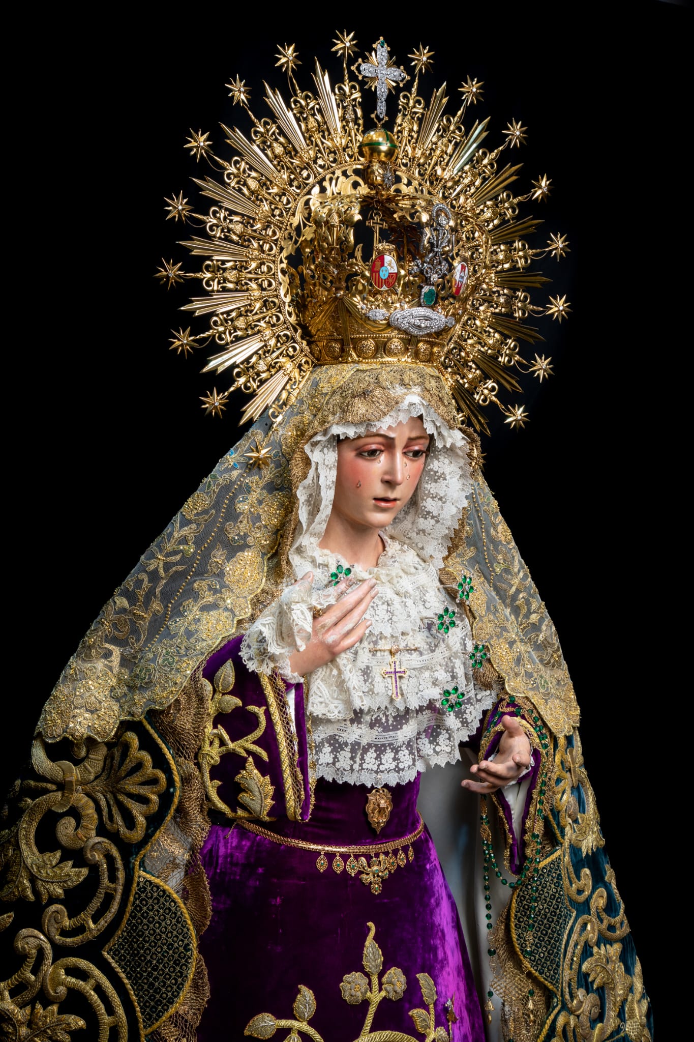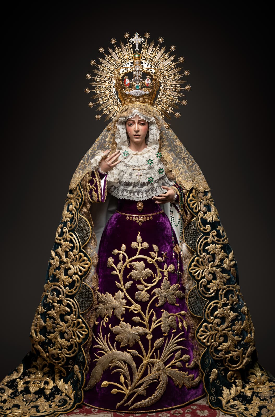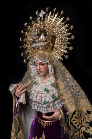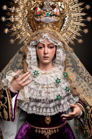 Amanece la Virgen de la Esperanza ataviada para su Septenario con el manto ‘Esperanza Nuestra’, pieza realizada en 1962 por Guillermo Carrasquilla Perea con bordados procedentes del palio de Rodríguez Ojeda de 1907 y del de Victoria Caro de 1942. La toca de sobremanto es la conocida «toca de las rosas», interesante pieza fechada en los años 40 del Siglo XX.
