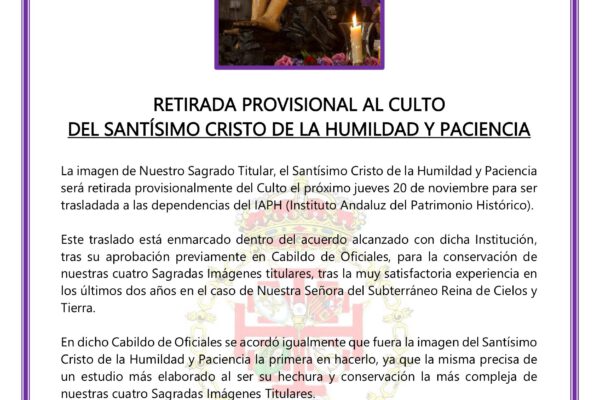 La Hermandad Sacramental de la Sagrada Cena ha anunciado la retirada provisional del culto de su Titular, el Santísimo Cristo de la Humildad y Paciencia. La medida se hará efectiva el jueves 20 de noviembre. Además, la imagen será trasladada al Instituto Andaluz del Patrimonio Histórico (IAPH), donde recibirá un estudio técnico detallado. Esta intervención…